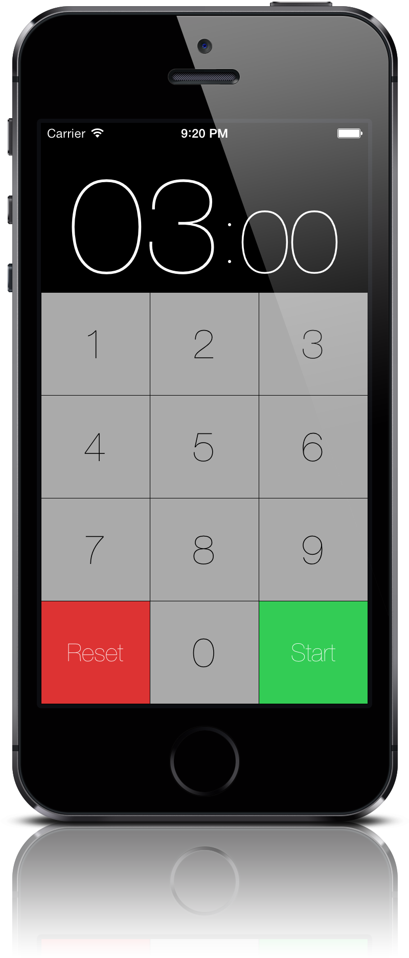 大きな時間表示とボタンで、見やすく、タップしやすいように設計されています。たとえば3分30秒を設定したいときは、[3][3][0]とタップして[Start]するだけ。時間になるとアラームとバイブレーションでお知らせします。